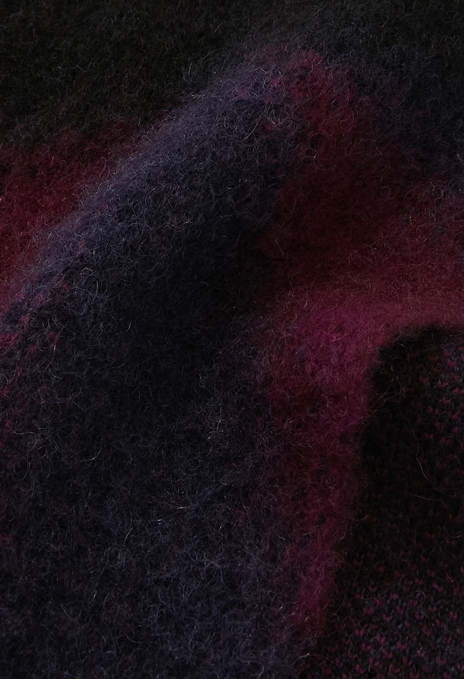 ソフトな肌触りのキッドモヘアとウール糸をミックスしたグラデーションジャカードのニットを採用しており、毛足を掻いて軽く柔らかなシャギータッチに仕上がっています。
