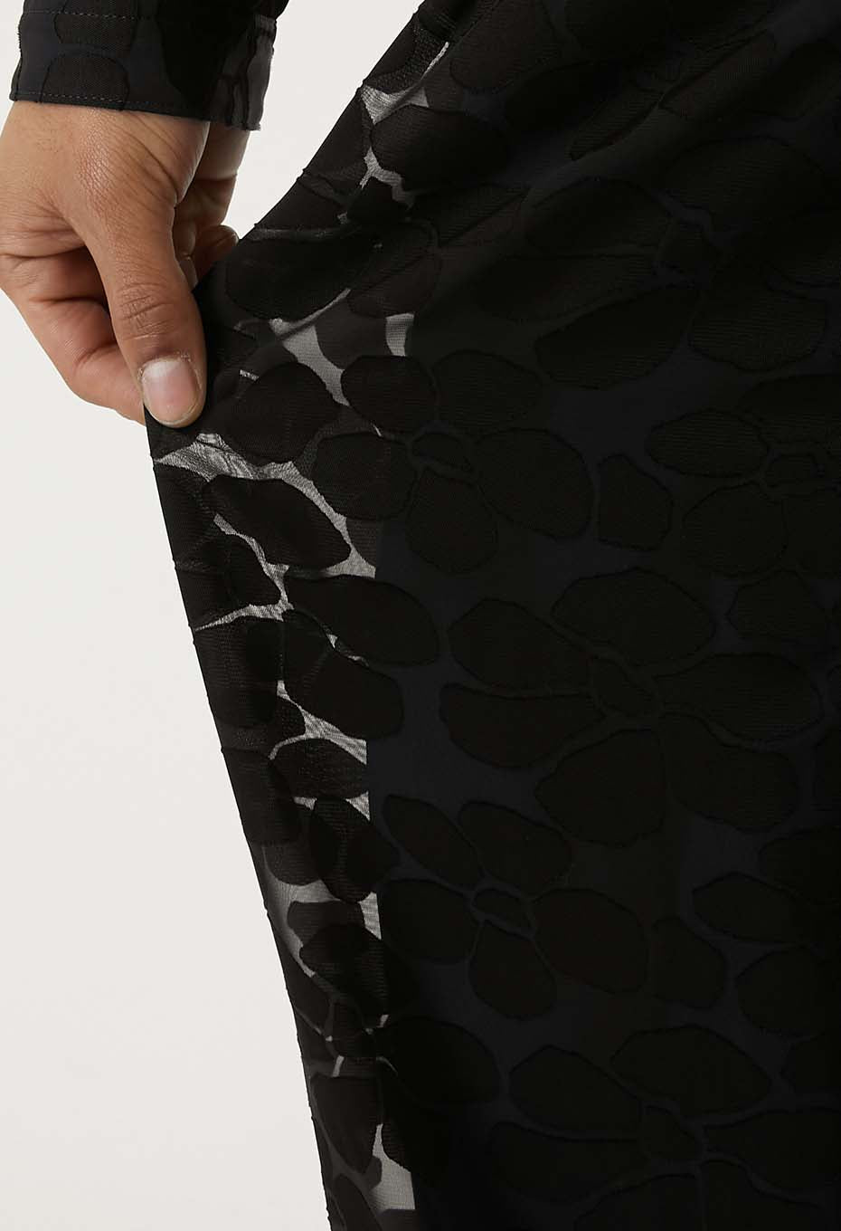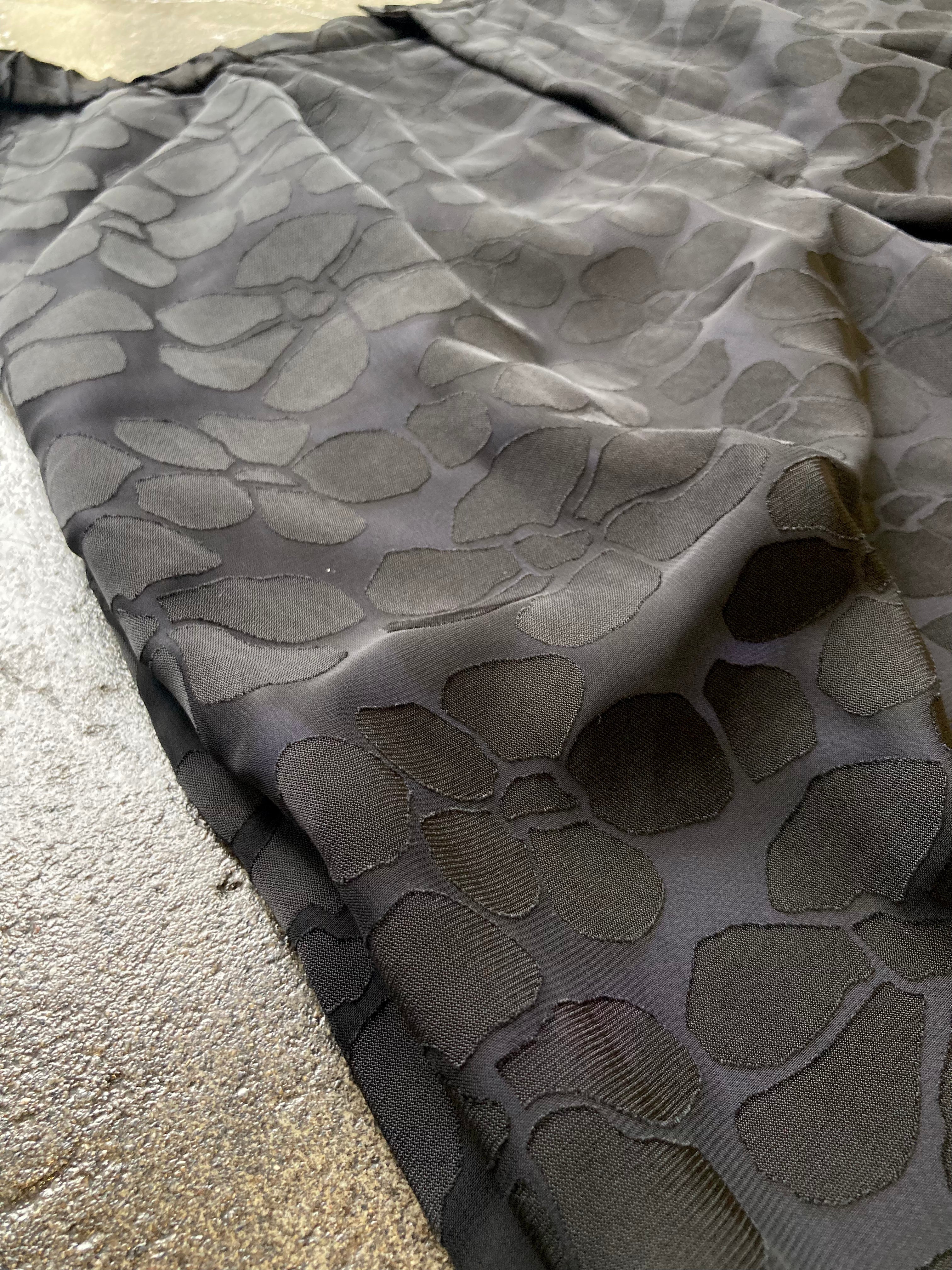 オフシルエットで揺れるように仕上げました。オパール加工を用い表現した「辻が花」が特徴です。地を抜き、柄部分を残して浮き立たせるよう加工することで、ソフトな肌触りと光沢感、シアー感を演出しました。表生地を活かせるよう、裏地に異素材を組み合わせた生地を用いています。