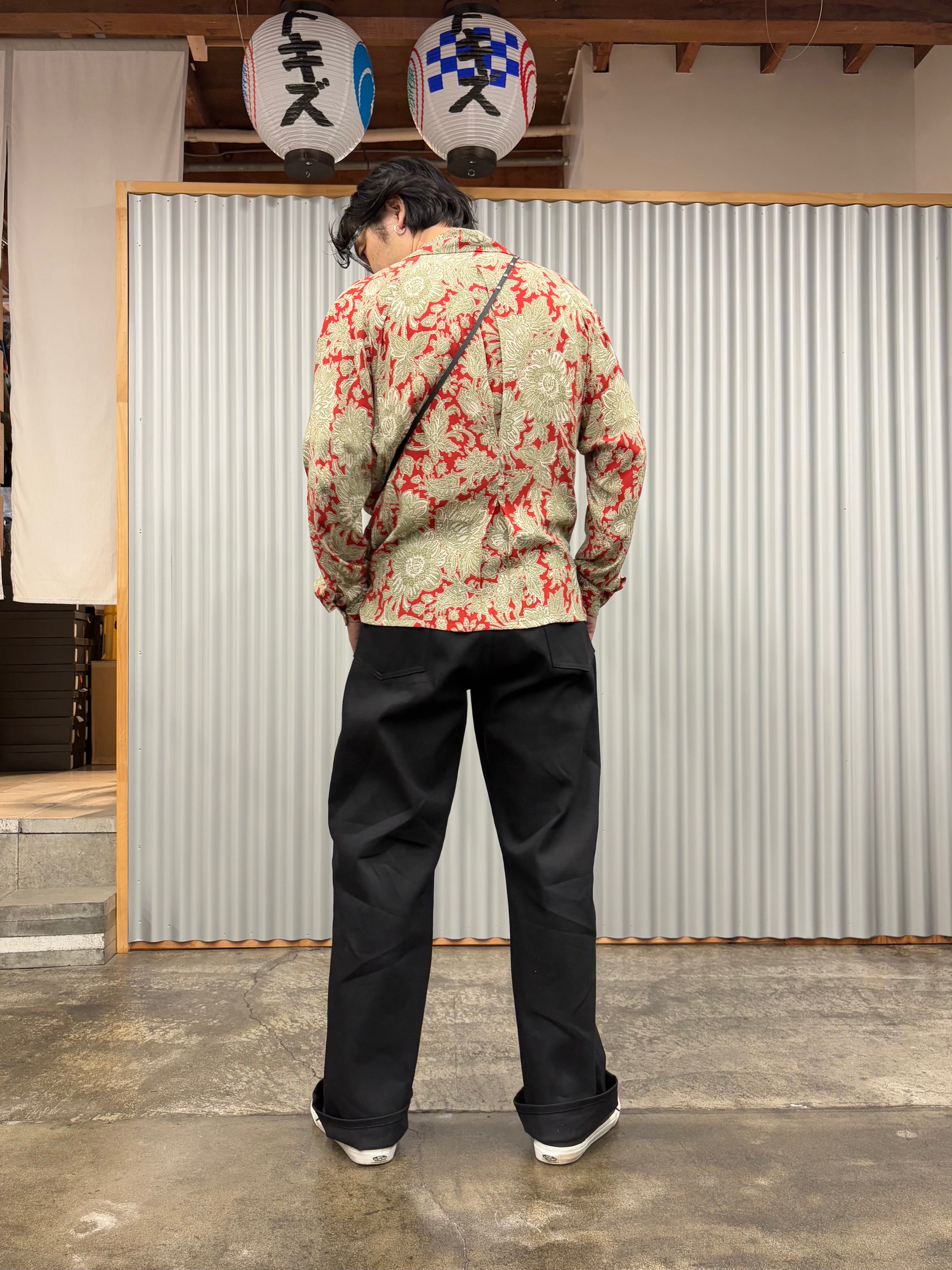 背面のシンチバック、そして裾をロールアップすると赤耳が覗くなど、ヴィンテージファンも納得のディテールが魅力。キップレザーを用いた黒無地のレザーパッチは絶妙なモード感を醸し出します。