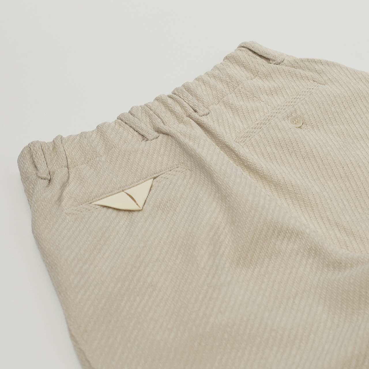 2タックデザインでベルトはクラシックな裁ち出し仕様。裾のドローコードでシルエット変化を楽しめます。後ろポケットの3角布には別素材を使用。後ろベルトのみエラスティックバンドを使用したバックイージー仕様です。