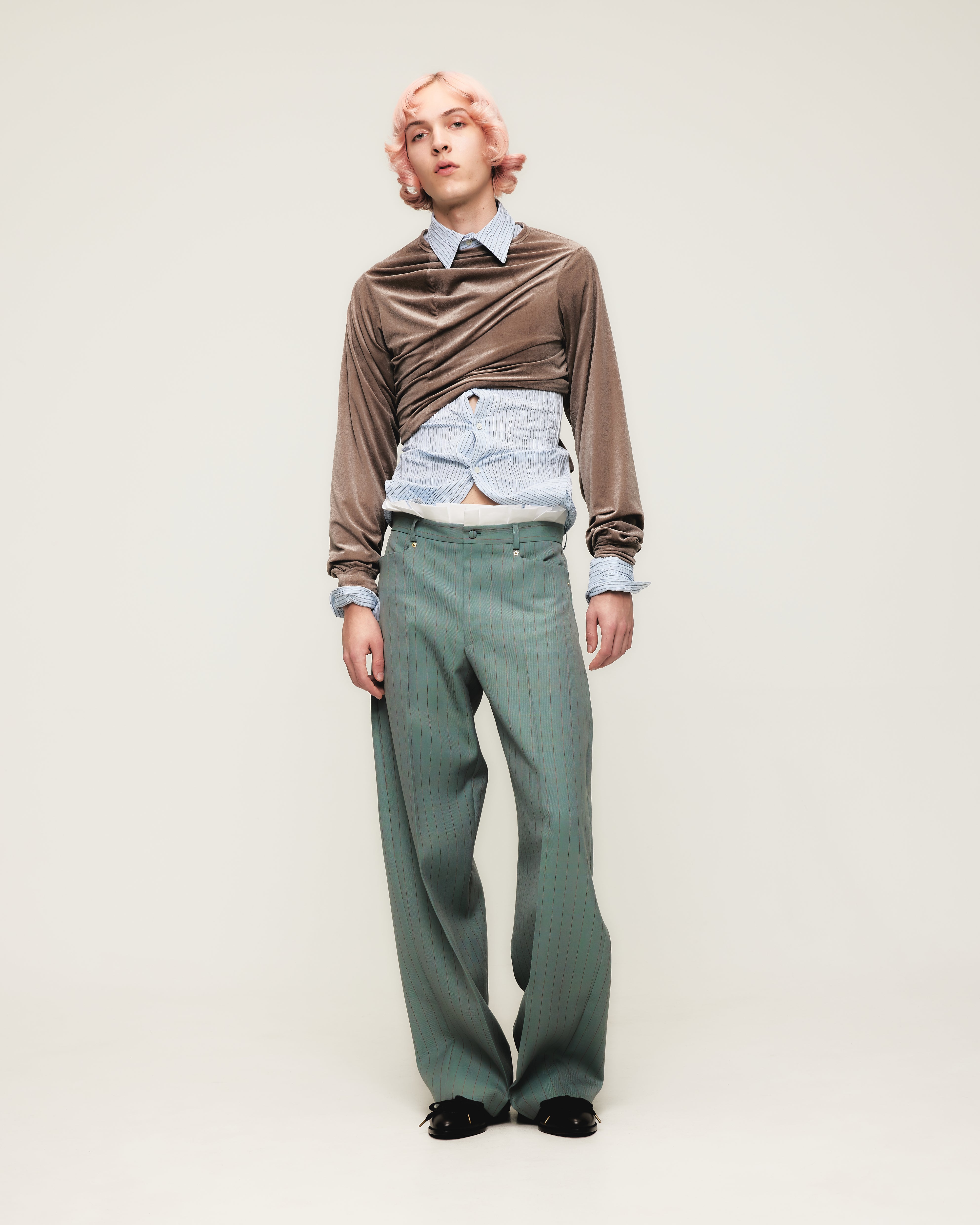 短めの身頃がねじれたようなデザインのロングスリーブTシャツ。