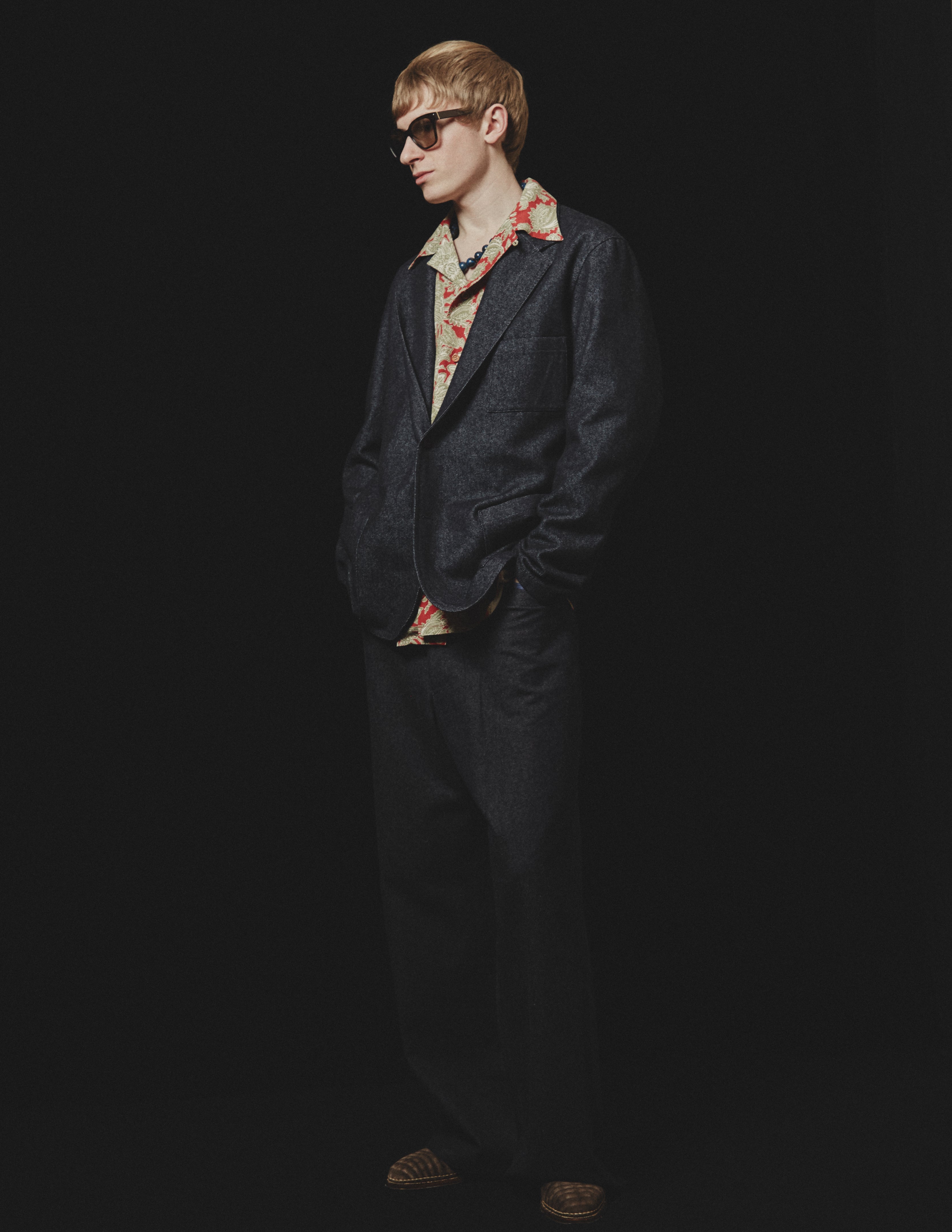 ラグランスリーブ、背中の特徴的なインバーテッドプリーツなど、ユーモアのあるディテールが随所に散りばめられています。