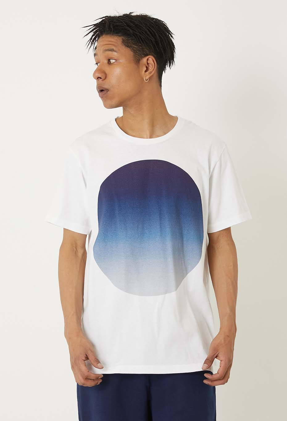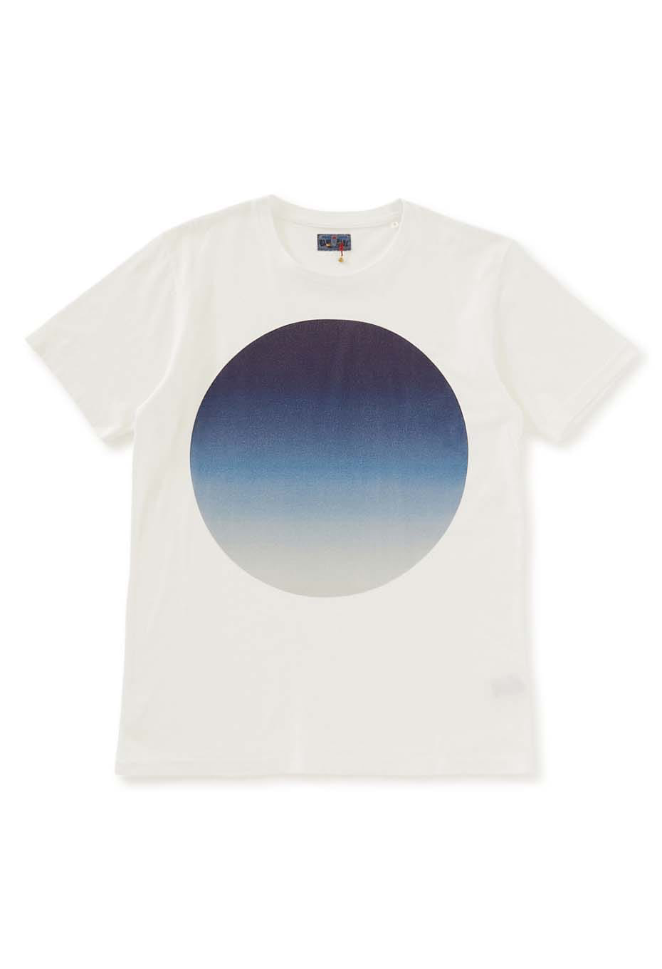 太陽や月などを連想する大きな丸をインクジェットプリントの手法を用い、グラデーションで表現しました。まさに一枚で様になるTシャツです。